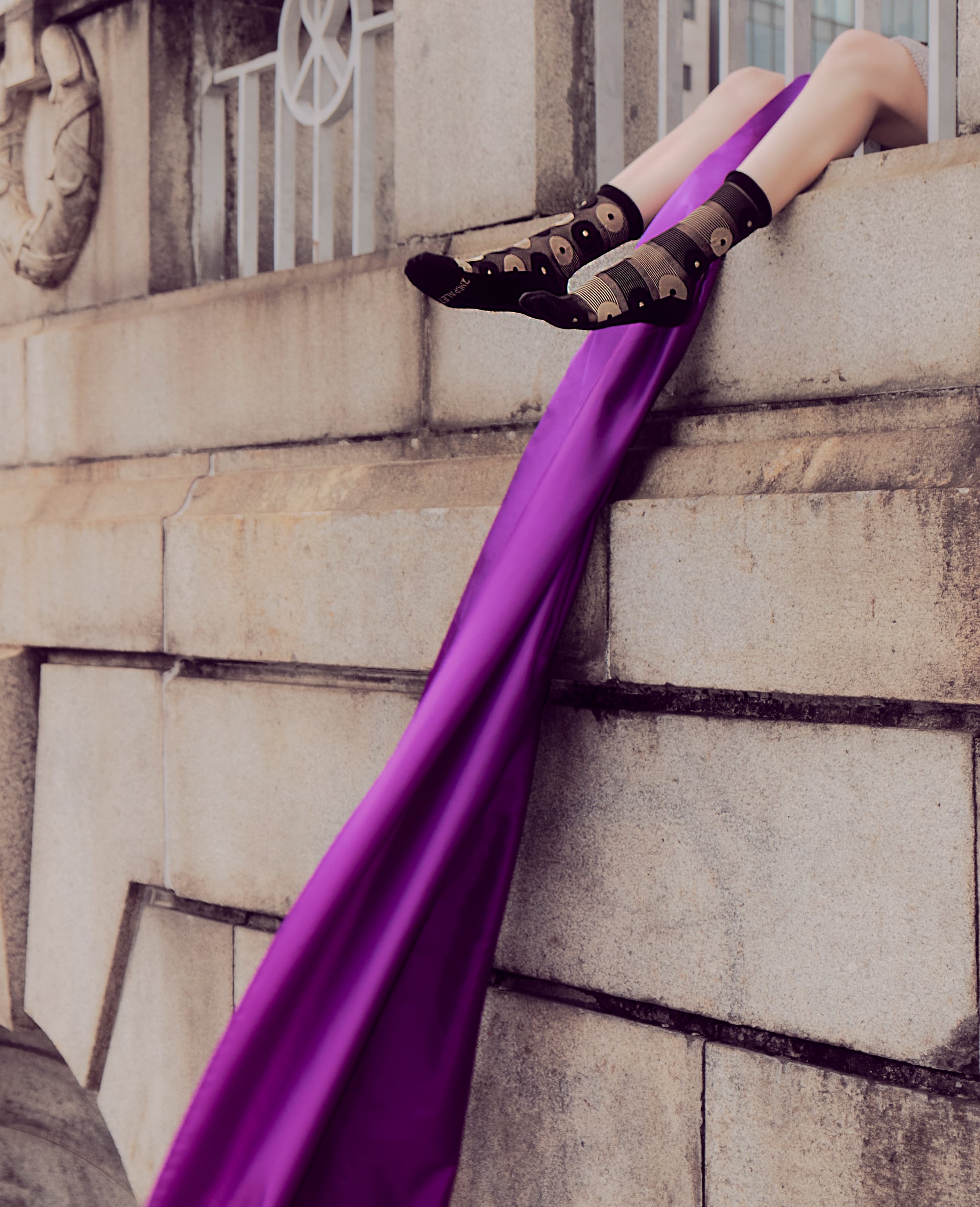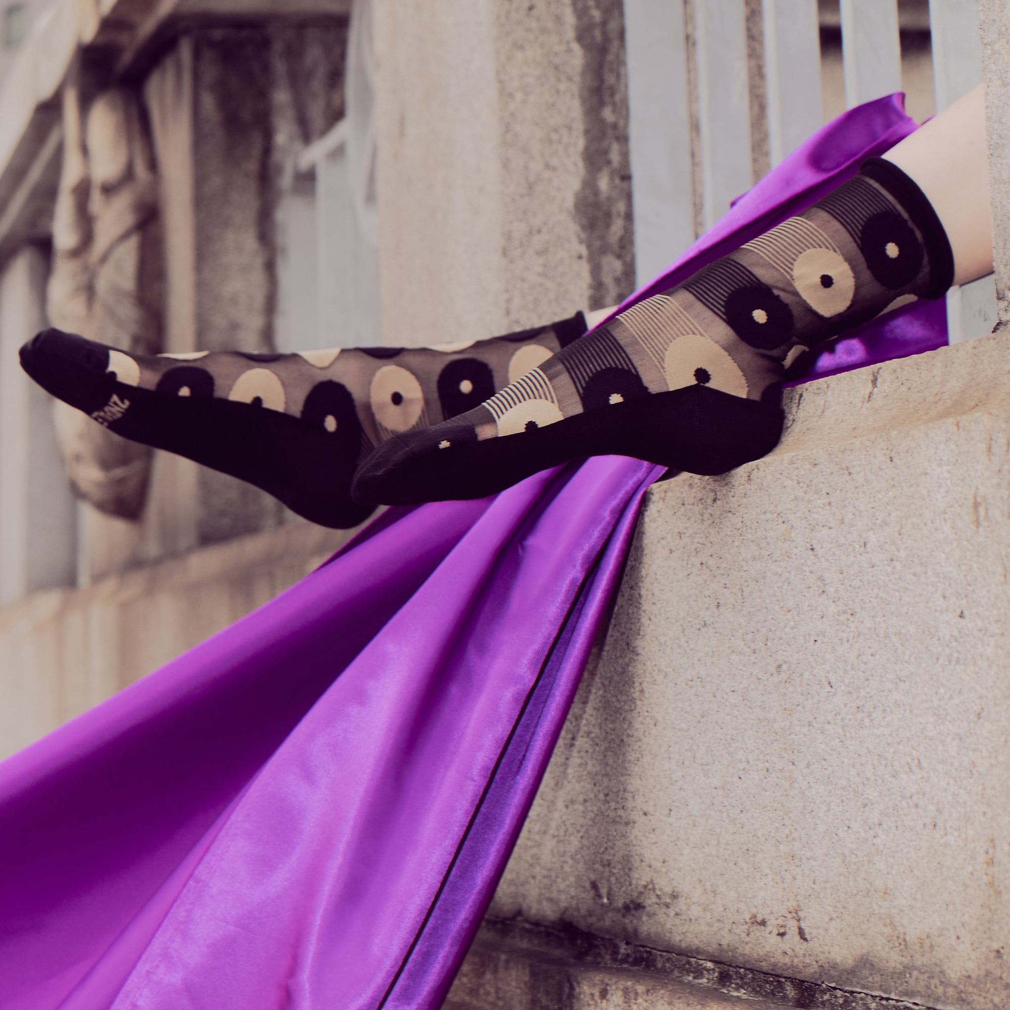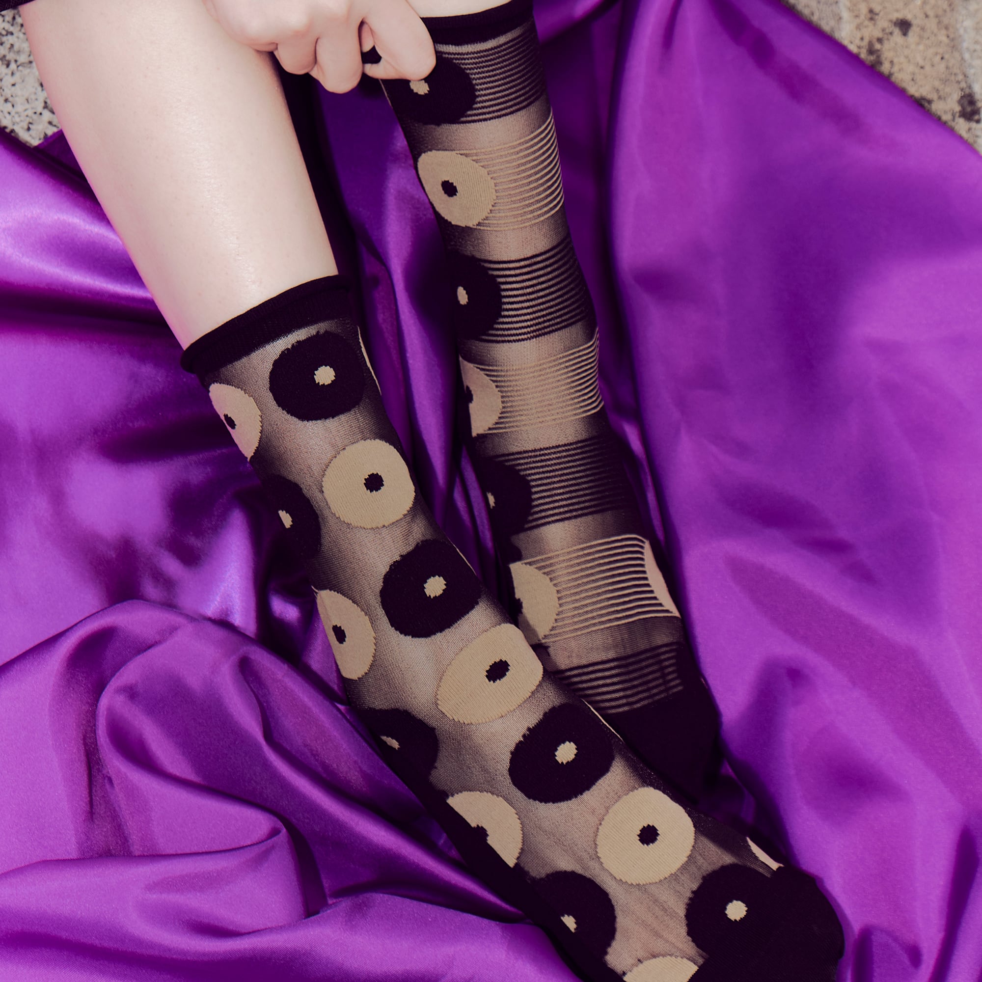 透け感のあるブラックにドット柄を重ねた一足。